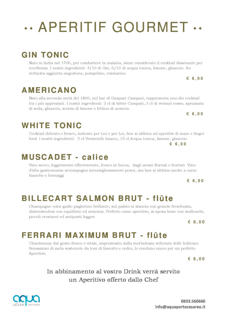 Un pacchetto composta da: 5 portate, (4 tra antipasti, primi e secondi + 1 dessert) a scelta dal menù alla carta di AQUA, 1 Bottiglia di Vino (Etichetta selezionata dalla Direzione) 1 Bottiglia d’Acqua. € 85 a persona