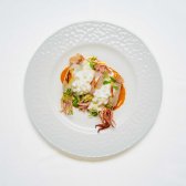 Risotto carnaroli Riserva San Massimo mantecato ala salicornia, crudo e cotto di gambero, estratto mandorle