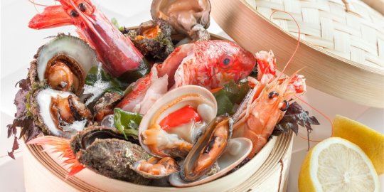 Tela di seppia cotta a bassa temperatura, sarago, serra, gambero viola cotto ai carboni, alga uva e maionese di gamberi